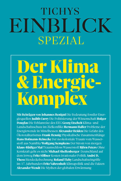 Der Klima und Energie-Komplex ein neues Tichys Einblick spezial Während weltweit Kernenergie und fossile Energiequellen boomen, kappt die Bundesrepublik ihren Zugang zu günstiger und sicherer Energie freiwillig. Der Wohlstand wird einer vermeintlichen Hypermoral geopfert. Am Ende sind wir alle ärmer, und die Politik kann ihre Klimaziele trotzdem nicht erreichen. Nur ein paar grüne Profiteure werden reich, sehr reich. Aber ziemlich wahrscheinlich leidet Deutschland, und der wirtschaftliche wie der soziale Fortschritt werden zurückgedreht. Es gibt keine Zukunft ohne preiswerte, jederzeit verfügbare und stabile Energieversorgung. Und wir sollten aufhören, die letzten Naturräume Deutschlands dem industriell-politischen Komplex zu opfern. Da ist das Märchen vom „grünen Wasserstoff“ aus der Wüste (der, wie wir zeigen, unbezahlbar wäre und niemals kommen wird) oder das Glaubensbekenntnis, man könne eine Industrienation allein mit „grünen“ Energiequellen versorgen – ein Traum, der, wie wir zeigen, völlig unmöglich ist. Unsere Autoren benennen die Mythen der Klimareligion und stellen ihnen nüchterne Fakten entgegen. Wir wollen einen Beitrag dazu leisten, dass unsere Energiepolitik sich auf Maß und Vernunft rückbesinnt. Mit Beiträgen von Johannes Benigni +++Judith Curry +++ Georg Etscheid +++ Hermann Haller +++ Alexander Heiden +++ Frank Hennig +++ Hans Hofmann-Reinecke +++ Wolfgang Kempkens +++ Klaus-Rüdiger Mai +++ Björn Peters+++ Michael Shellenberger +++ Fritz Söllner +++ André D. Thess +++ Roland Tichy +++ Fritz Vahrenholt +++ Alexander Wendt